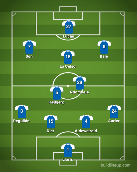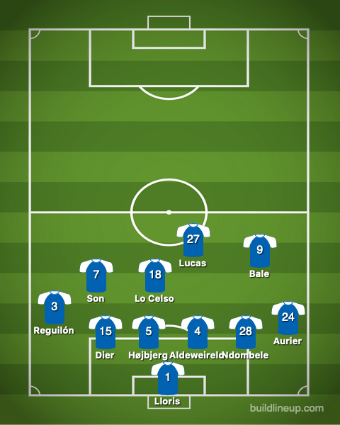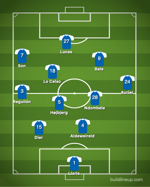 2) Pass to Højbjerg who will look for Ndombele, who then plays a vertical ball to Lo Celso or Lucas or a splitting diagonal to Bale/Son. If Ndombele is covered, Højbjerg recycles possession or passes to Reguilón.