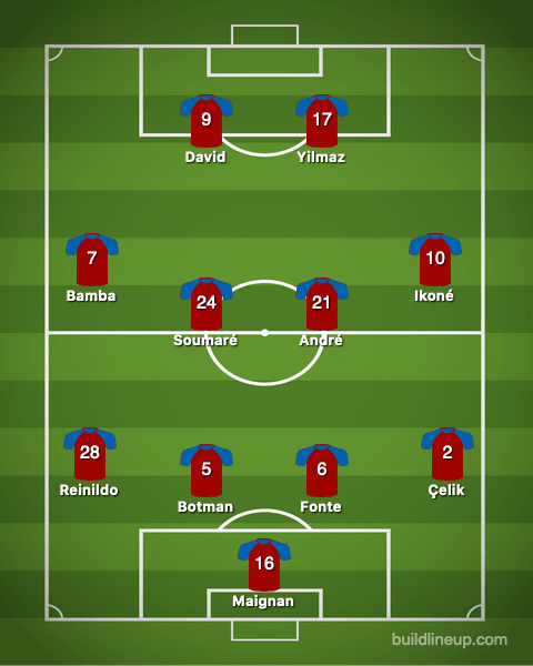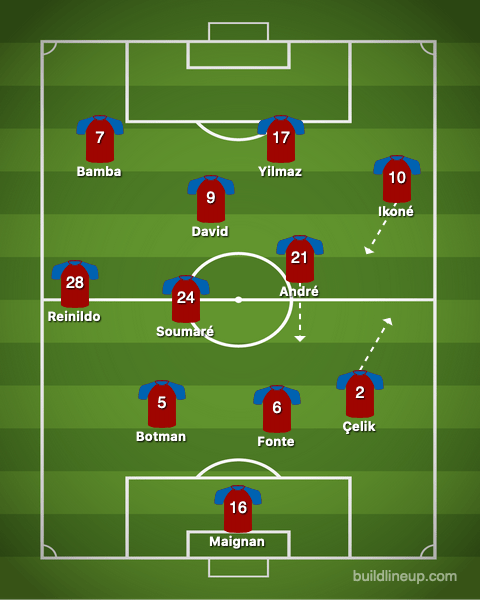 Galtier builds up from the center backs of José Fonte and Sven Botman. They start the attack and attempt to find one of the two midfielders who has dropped back or a fullback who has come alongside to form a back three. This is a feature used fairly often by Galtier and allows his team to overload the center of the pitch. One fullback, such as the right back Mehmet Çelik, will stay back initially to form a back three while the other fullback pushes high up the pitch.