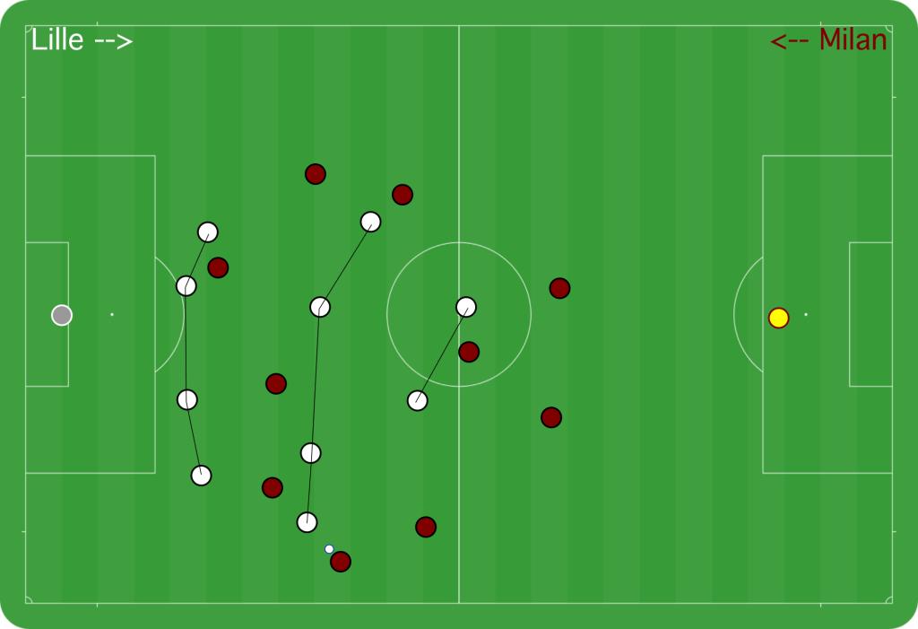 Lille, however, is not a long-buildup team. Galtier favors moving the ball up the pitch relatively quickly. He wants to get the ball near the opponent’s box as opposed to keeping it near Lille’s. The movements described above help create space either centrally or on the wings to move the ball—and Lille has little preference where to play through, with a pretty even number of attacks through the middle and each side of the pitch.
