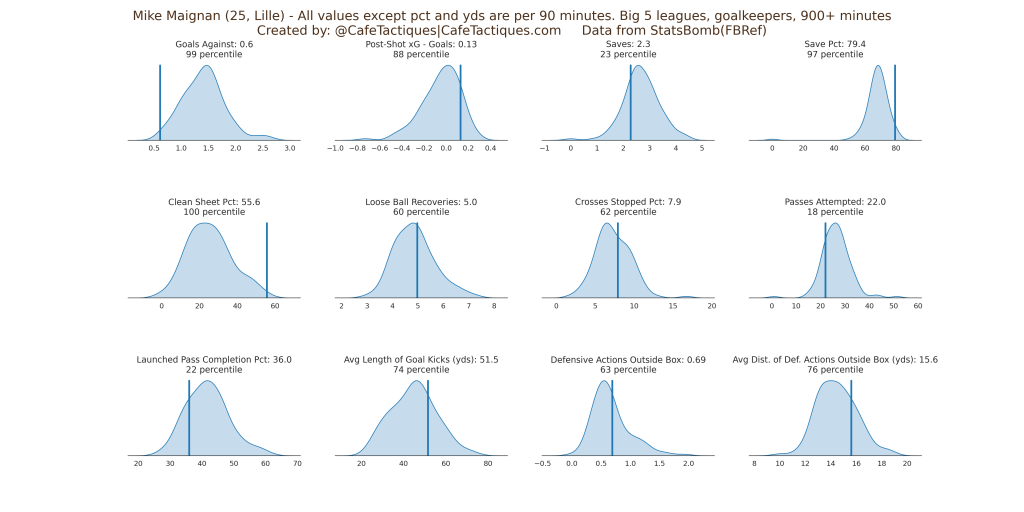 Lille’s strength this season stems from their sturdy defense. Lille have let in just 20 goals after 33 games, the fewest in the league. Goalkeeper Mike Maignan has recorded 18 clean sheets, the most in the league. Maignan and the Lille defense also record the best minutes per goal against, allowing a goal every 149 minutes. While Lille are a team with a number of gifted attacking talents, the team’s major strength is their defensive organization.