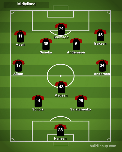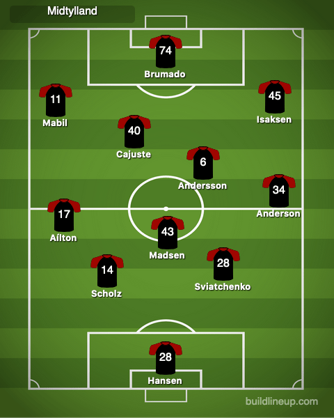 Midtjylland built up from a back three of both center backs and Madsen, who dropped to sit in front of Sviatchenko and Scholz. The fullbacks remained deeper in the first half than the second, but were on the touchline. Typically, Andersson pushed higher than Aílton. Every ball went through Madsen.