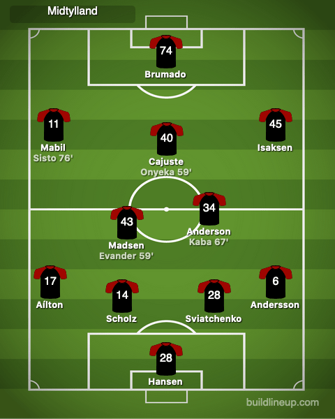 Midtjylland played a decent game but were compromised by their individual and team errors. They repeatedly got beat by Sønderjyske’s runs behind their defenders yet never dropped their lines nor had one of their center backs act as a sweeper. Many misplaced passes gave possession back to Sønderjyske, and Brian Priske didn’t take Sønderjyske seriously from the start. Once the substitutes came on, like Sisto and Onyeka, Midtjylland had more chances. However, throughout the game, their inability to cope with Sønderjyske’s long-ball game plans led to their defeat.