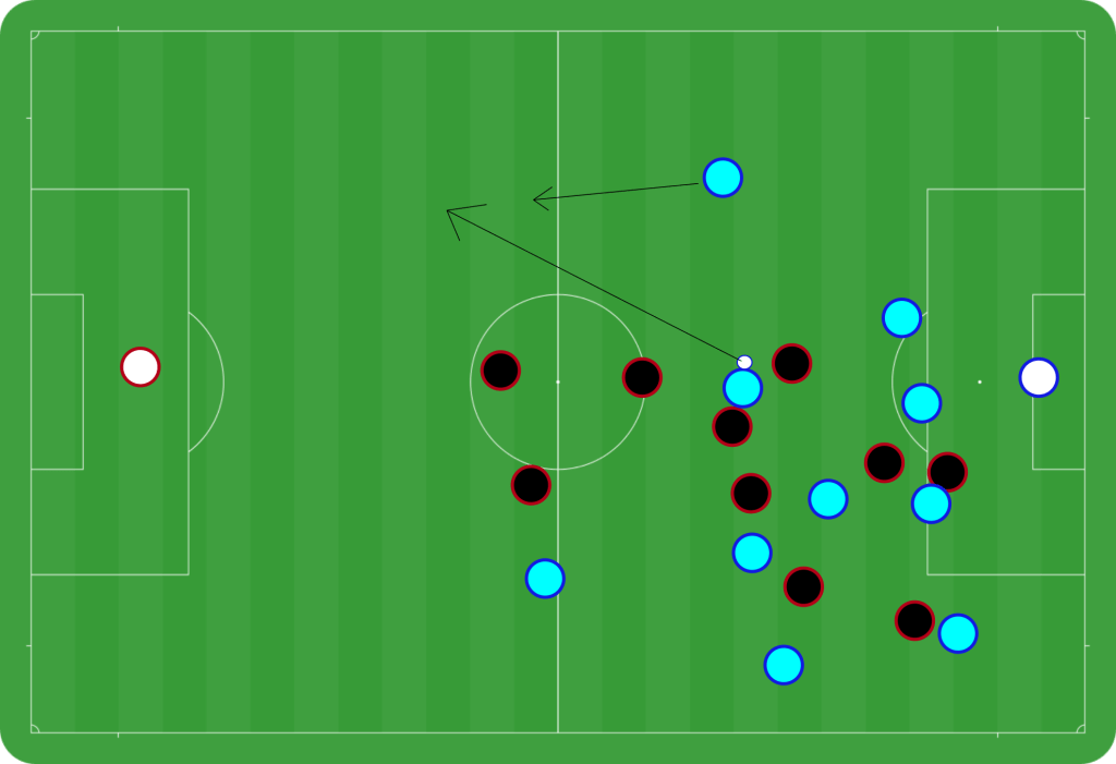 Both of Simonsen’s goals came from this attacking pattern. For first goal in the 49th minute, he sprinted into the box past Aílton as Finne chipped the defensive line. Simonsen’s second goal came via a pass from deep into vast amounts of space while Midtjylland were out of position. I will show a diagram of this goal in Midtjylland’s defensive section. Overall, Midtjylland couldn’t handle the direct attack down Sønderjyske’s right wing.