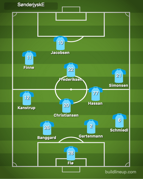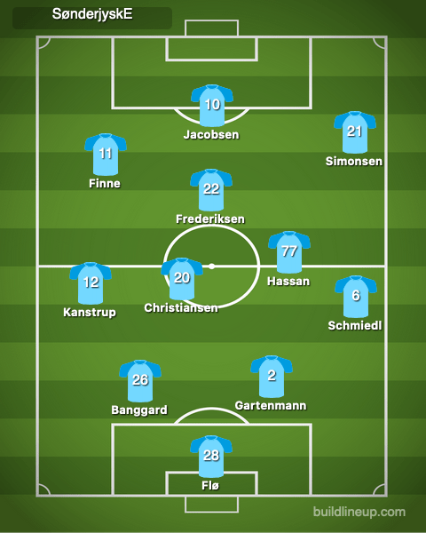 Sønderjyske moved the ball up the pitch at a high tempo, mainly through quick long balls or sprints down the wings from the fullbacks or wingers. Simonsen was the main attacking threat, so Sønderjyske favored their right wing. Simonsen stayed wide a majority of the time to allow for a counter-attacking outlet once Sønderjyske won the ball back.