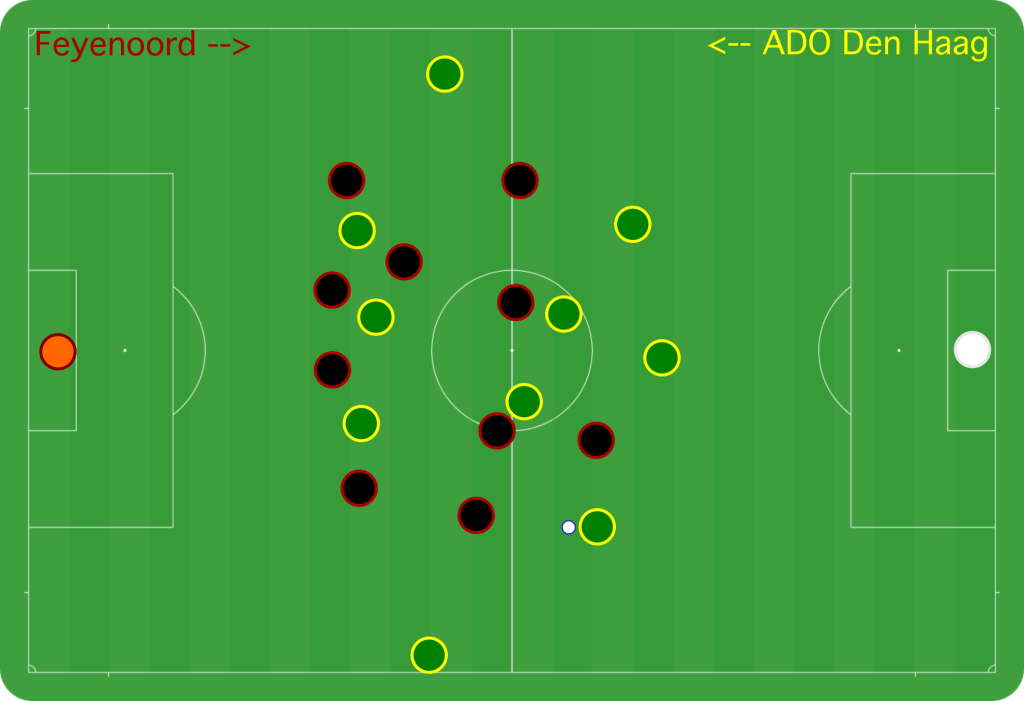 ADO used two passing patterns to progress the ball up the pitch. One patter was vertical passes between Feyenoord defenders. Once one midfielder received the ball, they looked for an attacker between Feyenoord players. The midfielder would move to play a fast pass on the ground, surpassing the Feyenoord midfield in the process.