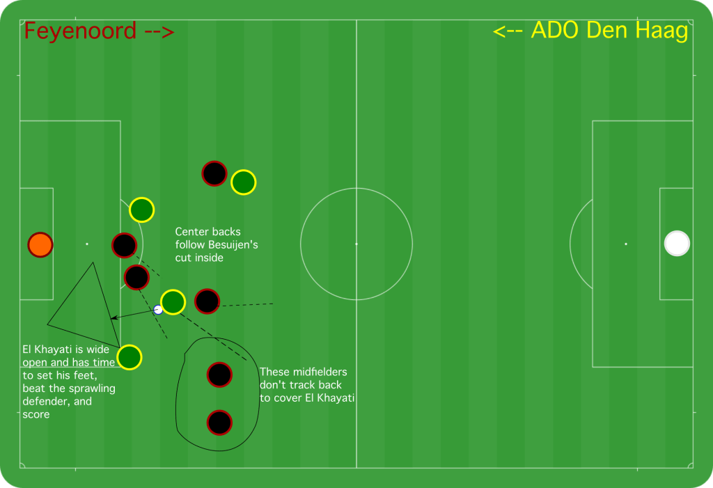 Feyenoord’s major weakness was in their defensive transition. While ADO’s first goal came from a bad giveaway and there was not a lot the defenders could do, both of ADO’s next goals came from weak transitions. El Khayati’s penalty came after Besuijen won the ball back and ran into the box. Feyenoord had just won the ball from Besuijen and were not switched on to defend so quickly. Because of that, it forced Senesi to foul Besuijen.