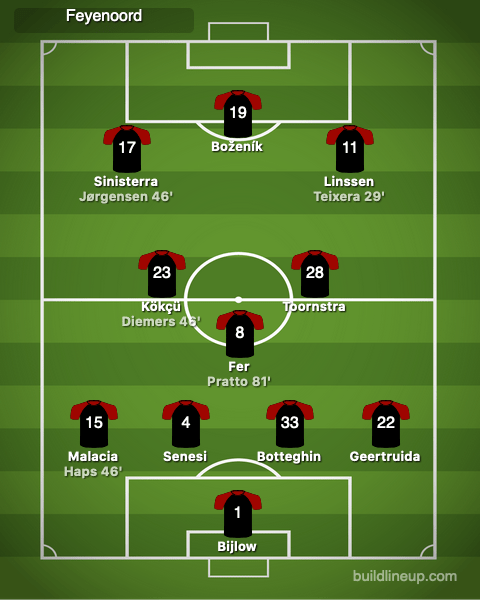The main team news before this match was Feyenoord’s missing attacker and club captain Steven Berghuis. Berghuis was sent off last week, so he was suspended for this match. Striker Robert Boženík started in his place.