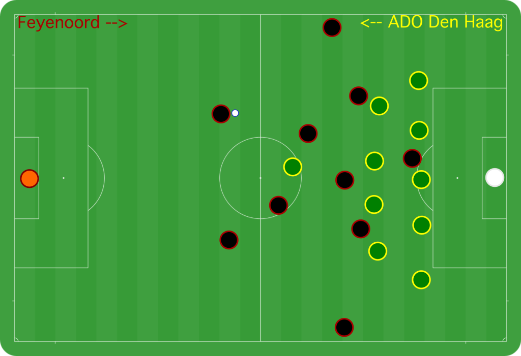 Once the ball left the center backs, they pushed up to form a very high line at or past the halfway line. This allowed Feyenoord to recycle possession while remaining in ADO’s half, but opened them up to dangerous counters, especially in the second half.