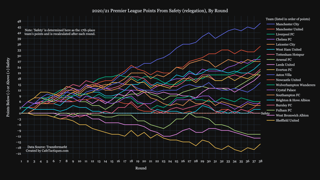 The above graph shows the “points from safety” for all teams over the season. The points required to be “safe” is calculated as the 17th-placed team’s points, because any number of points below them and that team is in the relegation places of 20, 19, or 18. This is recalculated each round.