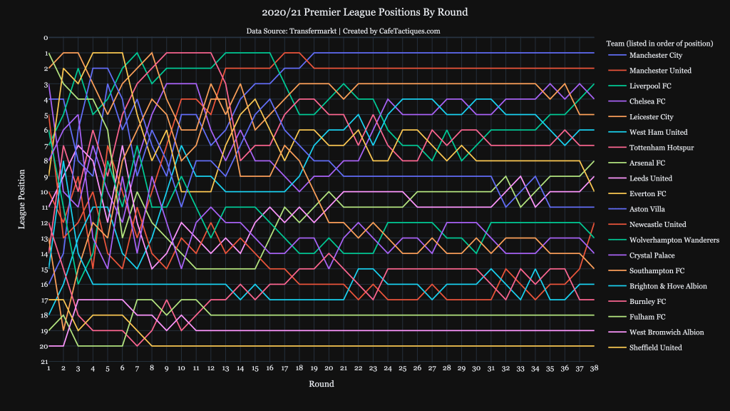 This final chart dealing with the teams shows their positions at the end of each round. It’s difficult to read at first with all the movement early in the season, but by midway we can track rises and falls in some teams. Tottenham is an interesting one to follow, logging 4 consecutive rounds in 1st, starting in round 9. After that they quickly dropped to 8th (from 1st in 2 weeks) before climbing back to 4th for 2 rounds. Spurs then struggled to stay in the Champions League race and hovered around 6th and 8th, before finally ending in 7th place to earn Conference League qualification.