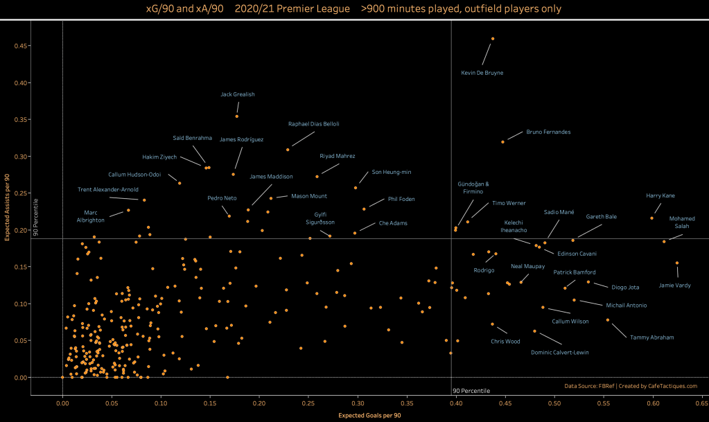 Two players stand out, Manchester City’s Kevin De Bruyne and Manchester United’s Bruno Fernandes. Both players were in the 90th percentile for both xG and xA per 90, as were a few other players, but they are outliers with their very high xA compared to xG. Both De Bruyne and Fernandes were big goal threats while being 2 of the 3 biggest assist threats for the season. Aston Villa’s Jack Grealish come in second behind De Bruyne for the largest xA/90 this season.