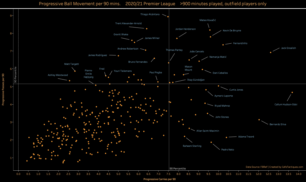 This next graph looks at players’ progressive ball movement per 90 minutes—progressive carries and progressive passes.