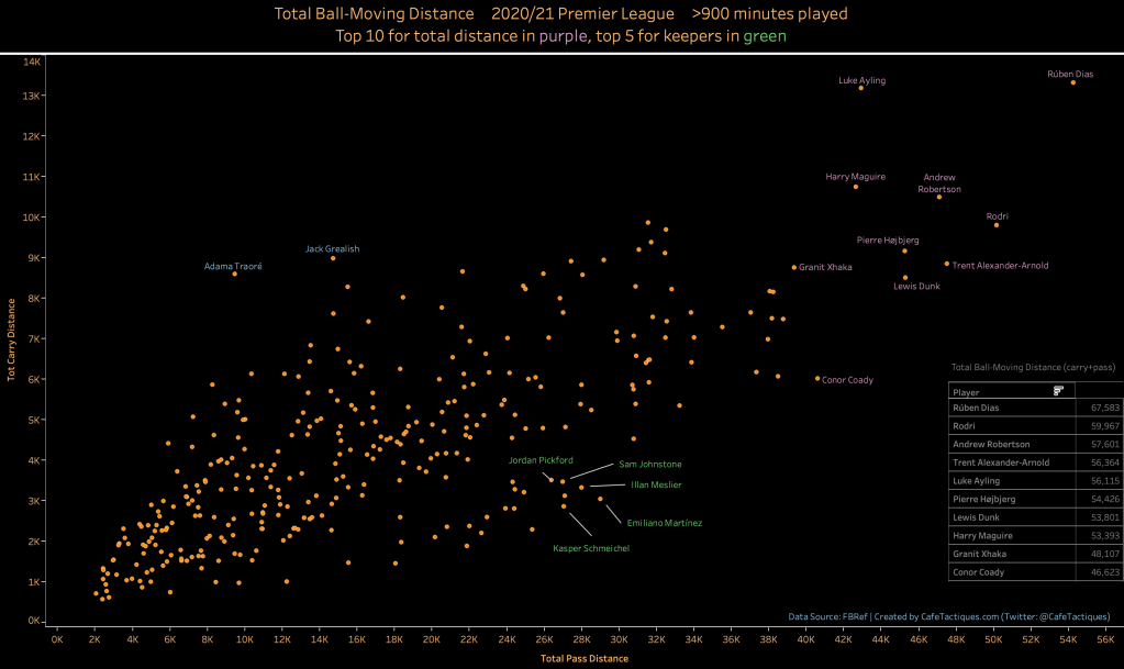 Manchester City’s Rúben Dias is a total outlier this season, moving the ball over 67,000 yards. Second place is also a Manchester City player, Rodri, with almost 60,000 yards. Next is Liverpools Andrew Robertson with about 57,600 yards. We can see the quick drop off after Dias’ number, showing how important the center back was to Pep Guardiola this season. Another player to mention is Leeds United’s Luke Ayling, who carried the ball almost as far as Dias this season, and sits 5th for total ball-moving distance. Both Ayling and Dias recorded insane ball carrying distances.