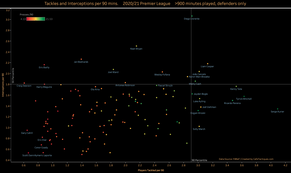 A few players, like Tottenham’s Eric Dier and Wolves’ Conor Coady are noted on the low end of the graph. Players like these record very few tackles and interceptions per 90. For some players, like Manchester City’s Aymeric Laporte, this can be due to their team’s dominance up the pitch, leaving the defenders with little work. But in Eric Dier’s case, Tottenham were not one of the best defensive sides this season, so his numbers should be cause for concern. However, players on this end of the graph also tend to not press as often as others, which could explain some of their lack of tackles and interceptions.
