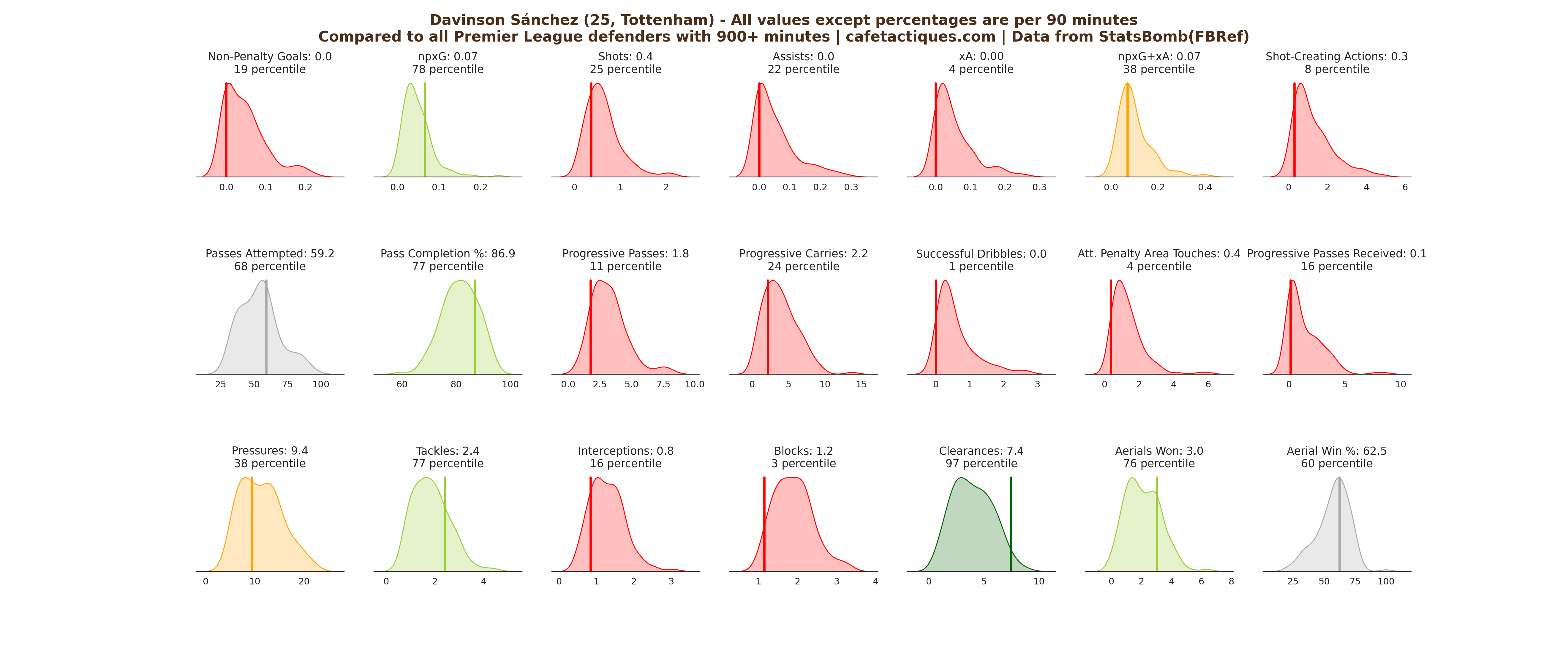 Finally, Davinson Sánchez records very admirable performances on many statistics, although two of his defensive statistics—interceptions and blocks—are very poor. He also records the highest non-penalty expected goals per 90 minutes of any Tottenham center back this season.
