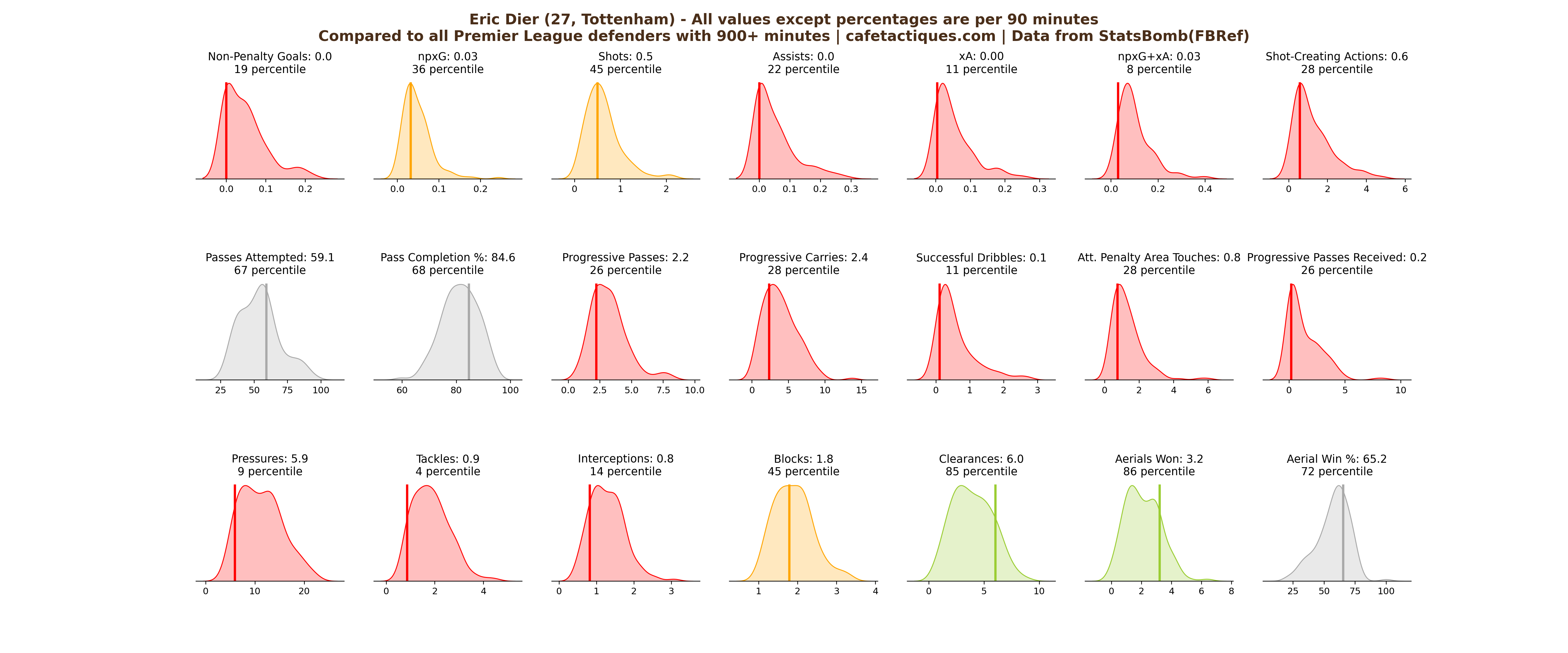 The figures below are show each player’s performance in 21 key statistics (first row for attacking statistics, middle row for midfield statistics, third row for defensive statistics), some of which are given in the radar chart above, and others which add more depth to our analysis. Each individual entry is the distribution for all comparable players, with the vertical line being the focal player’s performance. They are color-coded so that dark and light green are where a player performs at a high level, gray is relatively average, and orange and red are where the player is relatively poor.
