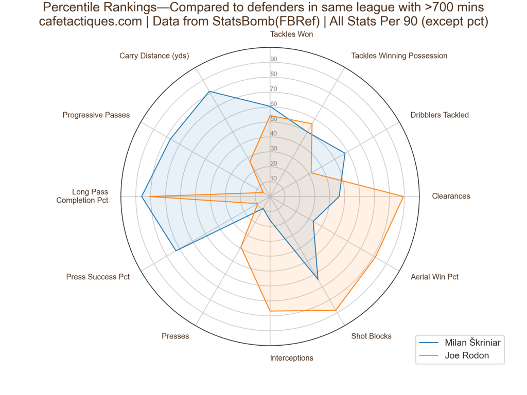 Joe Rodon would be a great pairing for Škriniar, with most of Rodon’s weaknesses balanced by Škriniar’s strengths and vice versa. The chart below shows how well their statistics balance.