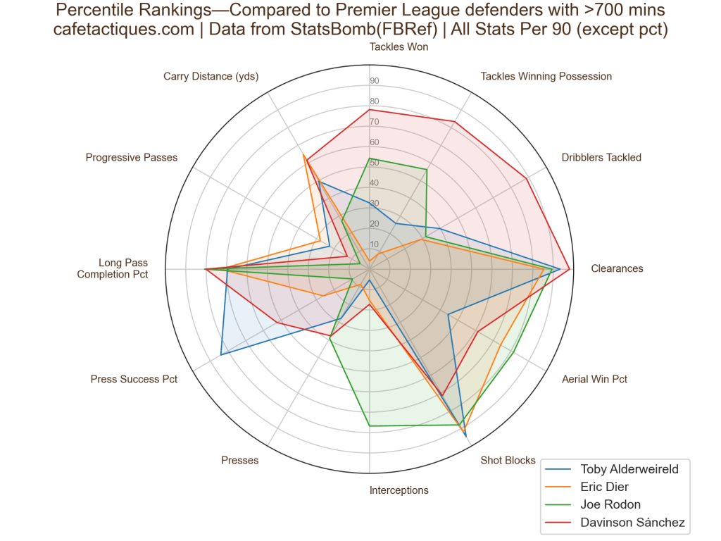 Toby Alderweireld is more rounded than Dier and performs better in most metrics, however he only performs great in clearances and is relatively average in a further 5 statistics. Only 3 of 7 of these defensive metrics are above the 50th percentile.