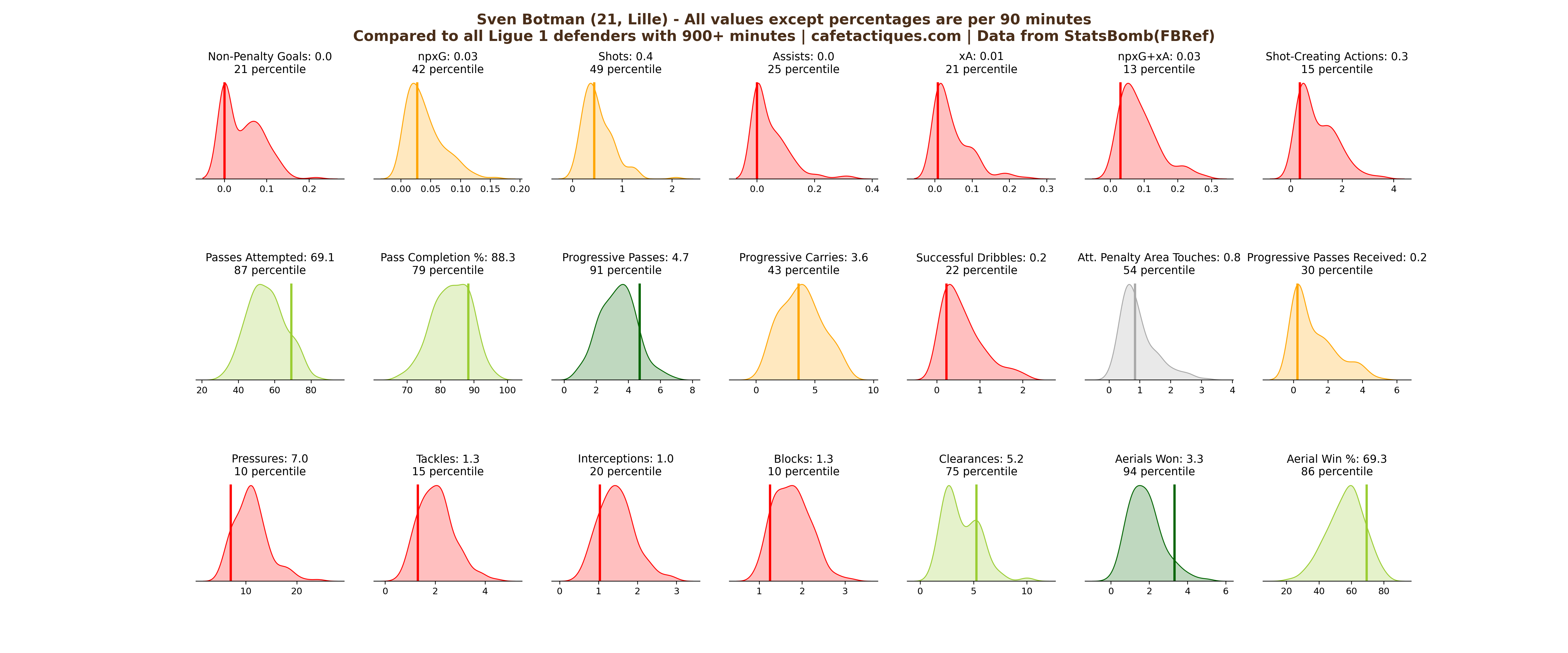 Sven Botman and Jules Koundé are both very good ball-playing center backs and passive defenders, but Koundé records better performances in most statistics. Botman played in a great Lille side who had fewer challenges to make than most squads, so his tackling metrics could be biased and appear lower than his true tackling ability. Overall, however, these players’ performances are very similar, but Koundé is better than Botman in most statistics.