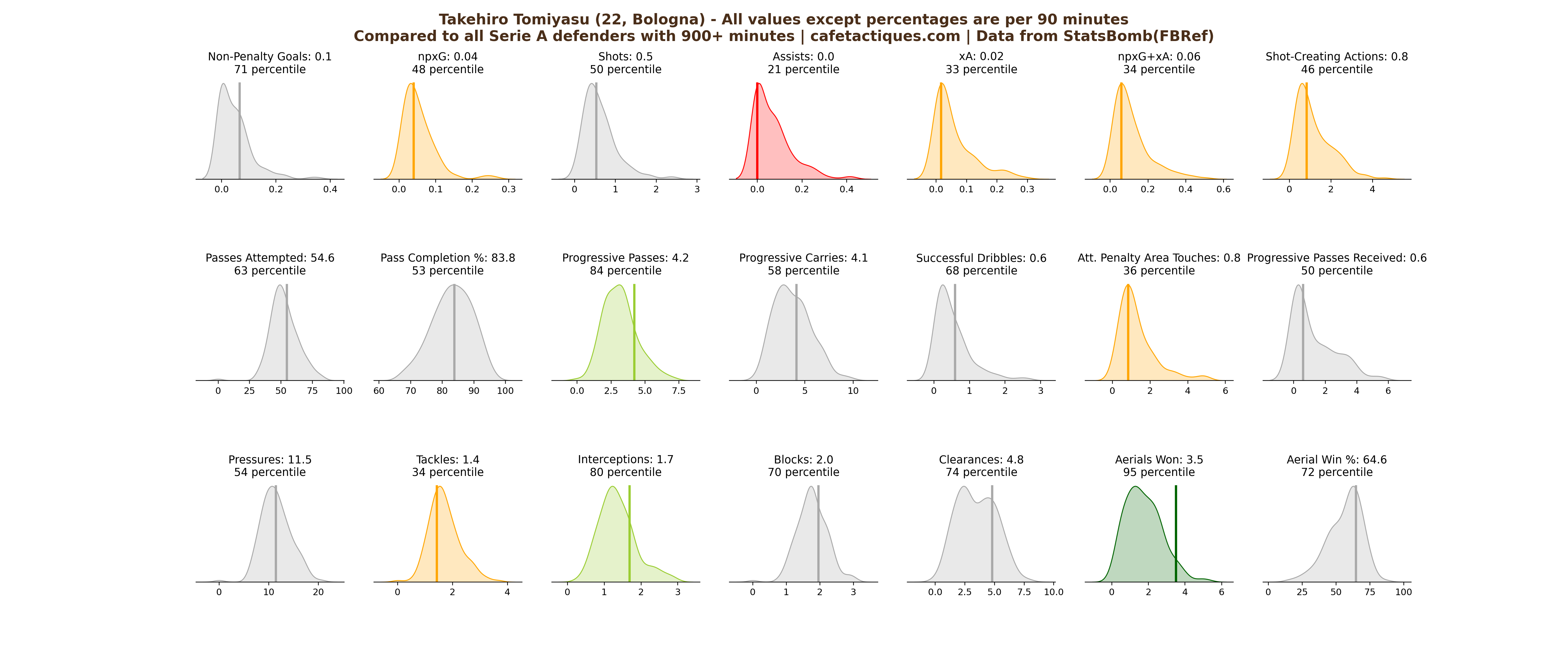 Tomiyasu is, again, a very well-rounded defender with no major weaknesses. Only two defense and midfield statistics are below the 50th percentile, and he’s one of the best Serie A defenders in the air. Tomiyasu is still developing—as are Botman and Koundé—but his current game shows few signs of weakness.