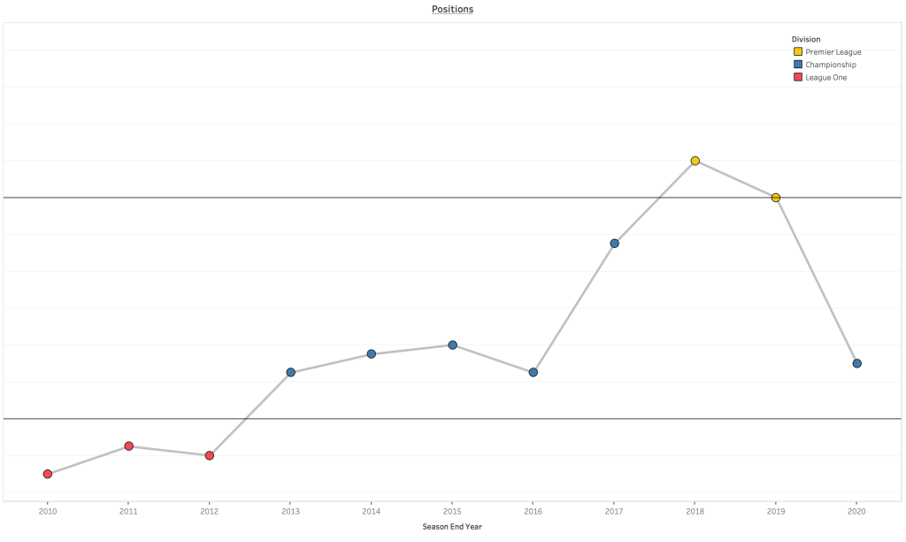 First, let’s take a look at Huddersfield’s league positions over the past 11 seasons with financial information. Note that this does not include the most recent 2020/21 season, as their fiscal year hasn’t ended yet.