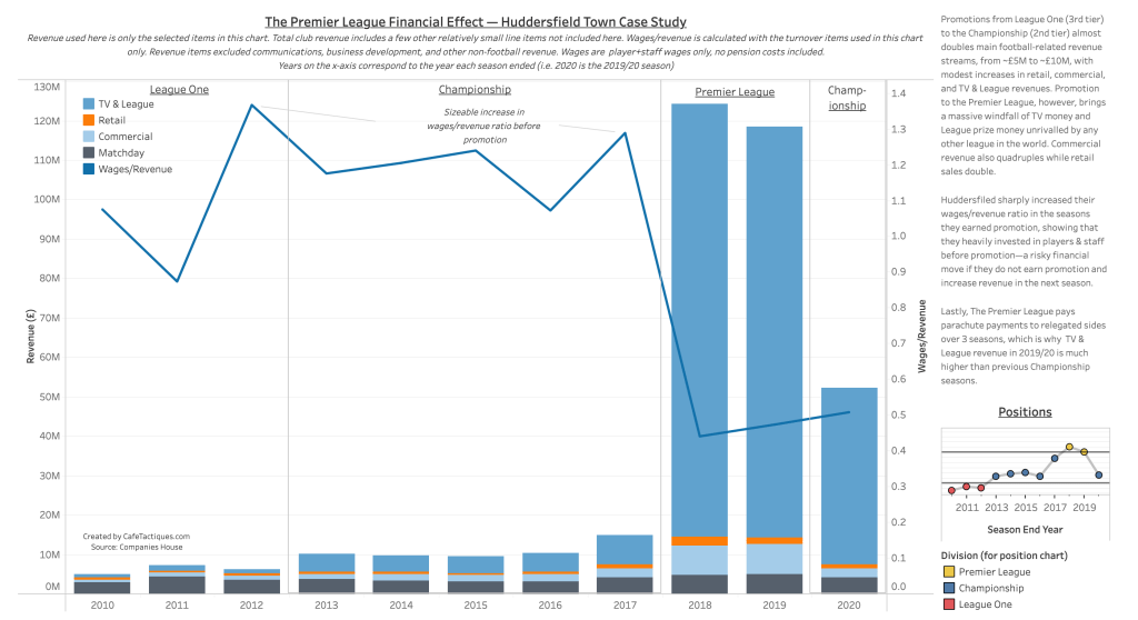 Huddersfield’s Commercial revenue quadrupled from £2,000,000 to £8,000,000 after promotion to the Premier League, while their Retail sales doubled from £1,000,000 to £2,000,000.
