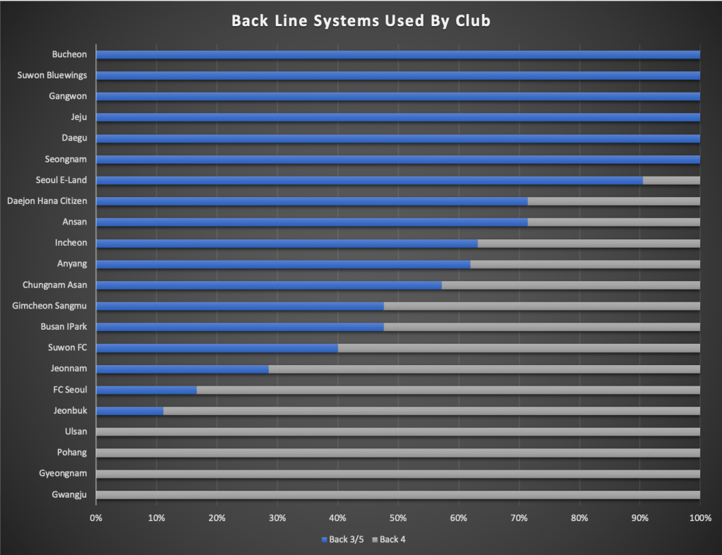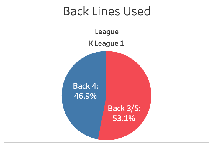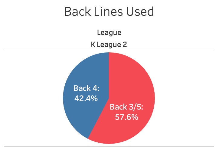 But in the meantime, we can see that the back 3 is the most popular system in South Korea, with 53.1% of all formations used in K League 1, and 57.6% of all formations in K League 2.