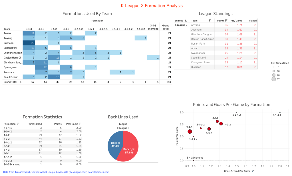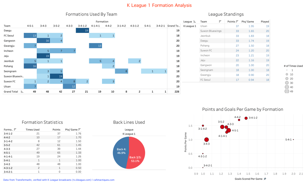 Finally, here is a dashboard showing the entire K League 1 analysis. Overall, it seems Daegu have the best formation, but no other team has attempted to emulate their success.