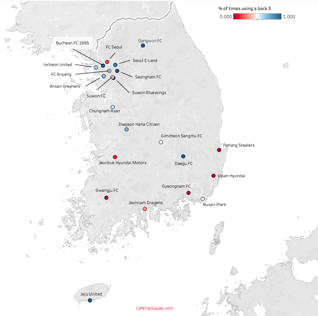A final interesting piece that arises when looking at the K League’s formation data is the geography of the clubs who use back 3s. Only 2 of the 9 clubs in the Seoul and Gyeonggi-do provinces primarily use a back 4—FC Seoul and Suwon FC. the other 7 all mainly use a back 3. Of the 13 remaining clubs outside the Capital Area, only 5 primarily use a back 3.