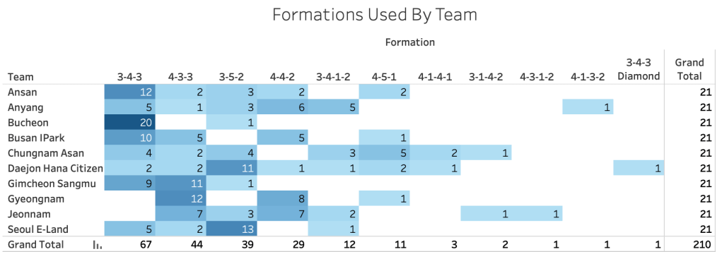 This table also shows what teams have tended to stick with a single formation for all or most of the season. Teams like Daegu and Jeju have only used a 3-4-1-2 and 3-4-3 respectively, while others like Suwon FC, Jeonbuk, and Seongnam have used a large spread of formations.