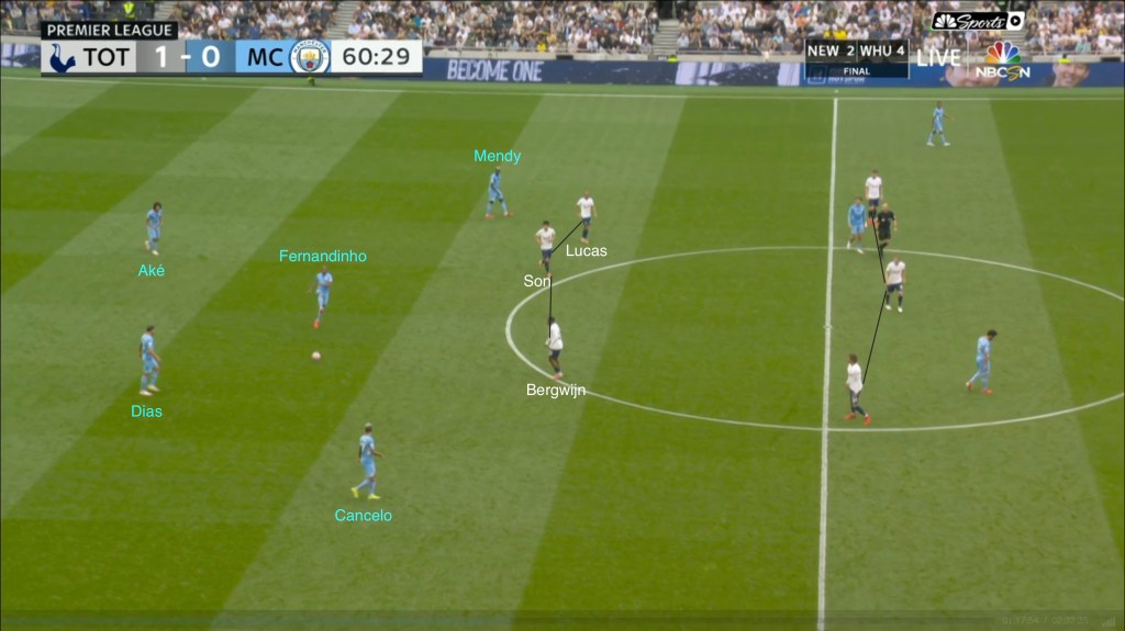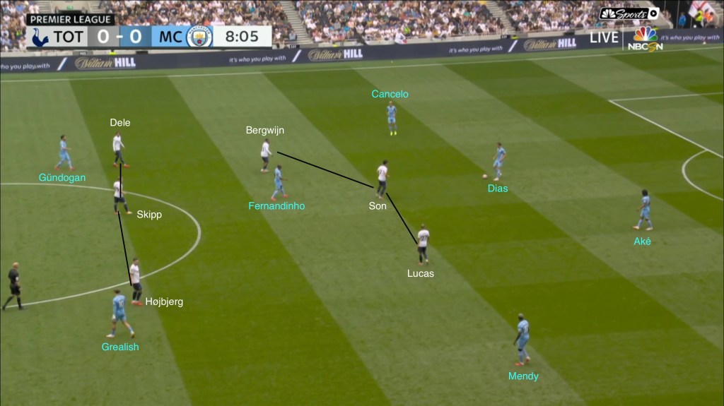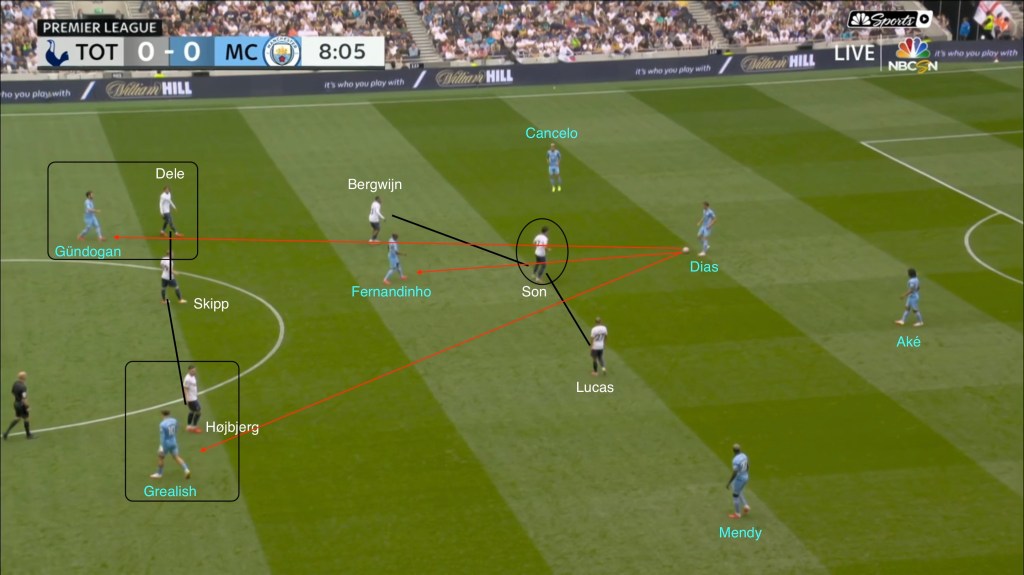 Son’s positioning slightly ahead of Lucas and Bergwijn allows him to be closer to Rúben Dias, closing down his angles. Son’s between Dias and Fernandinho, cutting that lane directly. Dias’s passing lane to Grealish is effectively cut by Lucas and Højbjerg, with both having a high chance of intercepting a pass to him. Similarly, Bergwijn and Dele are cutting the passing lane to Gündogan. Spurs allow Dias to pass freely to Aké or one of the fullbacks, knowing they won’t run up the wing and Tanganga is available to defend Grealish or Sterling if they pass to them.
