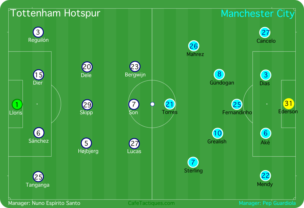 Probably the most effective tactic Nuno used was narrowing Lucas and Bergwijn while City were building up from the back. In attack, Lucas and Bergwijn acted as wingers and ran down the flank, crossing and cutting inside. In defense, however, they acted as right- and left-sided strikers. Lucas and Bergwijn almost never marked or even closed down City’s fullbacks, Mendy and Cancelo. Instead, narrowed when City had the ball in their defensive third or the midfield third and allowed lots of space ahead of the fullbacks.