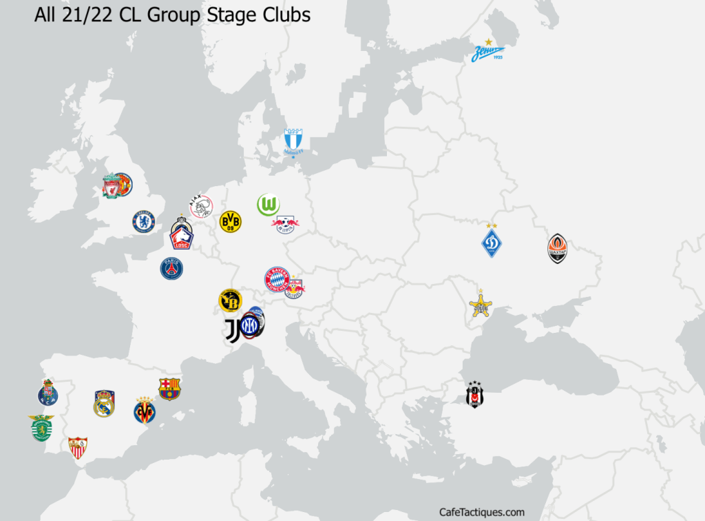 Here is a map of all the teams in the group stage this season. Follow this link to play around with the map yourself.