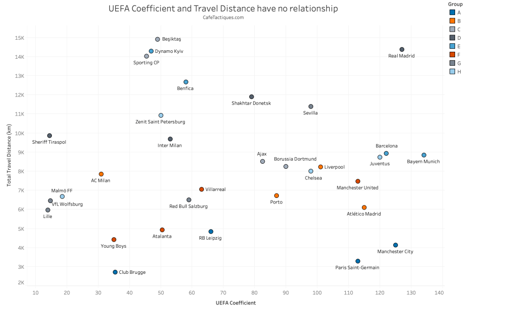 This final graph shows that, thankfully, there’s no relationship between a club’s UEFA coefficient (the higher, the better) and their total travel distance. Once again we see Real Madrid with much more travel than their main rivals for the trophy.