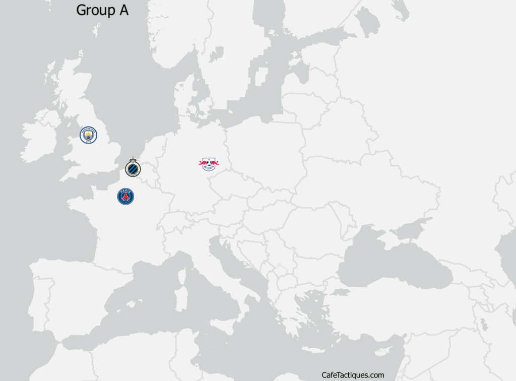The Belgian champions have trips to Manchester City, Paris Saint-Germain, and RB Leipzig—two countries bordering Belgium, and one sharing a water border.