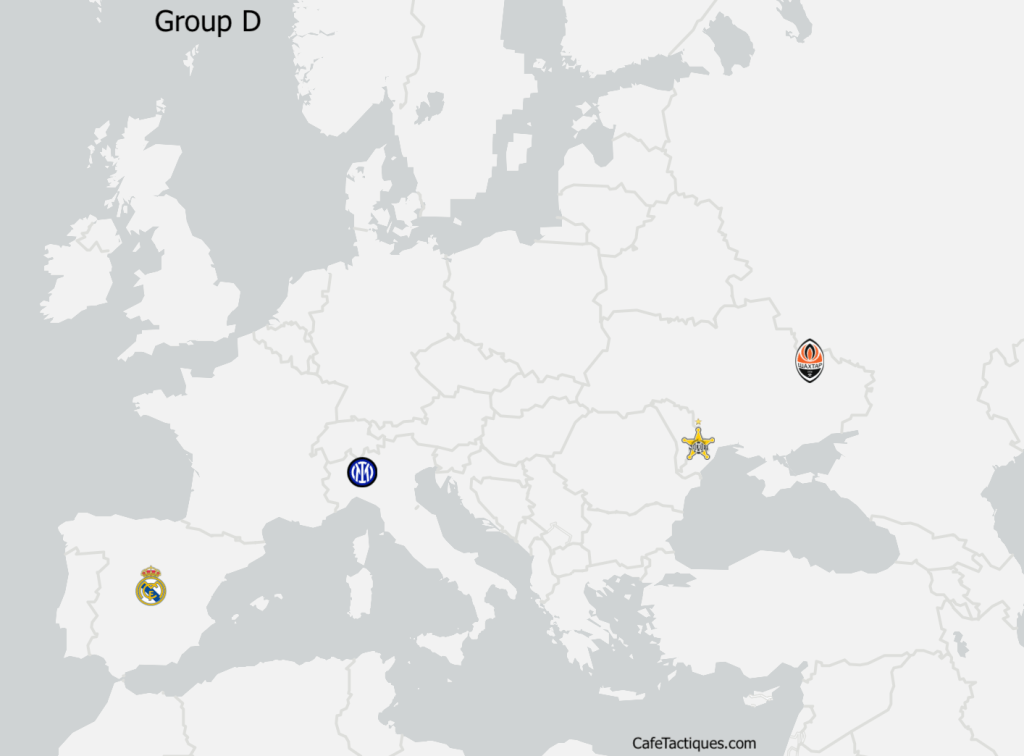 Following close behind Beşiktaş is Real Madrid, in Group D, who have to travel 14,370 km. Real have long trips into Eastern Europe to face Sheriff Tiraspol and Shakhtar Donetsk, along with a trip to Italy to face Inter Milan.