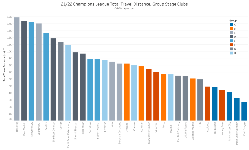 Group D combine for the most travel this season, with 45,779 km in total. The Earth’s circumference at the equator is 40,075 km, less than these teams’ travel. Inter and Sheriff benefit from being between Shakhtar and Real, but all of these clubs have to travel incredibly far for their away matches. Like mentioned above, it will be interesting to see how Real fares compared to other strong clubs like PSG or Manchester City, who have to travel almost 11,000 km less during their group stage.