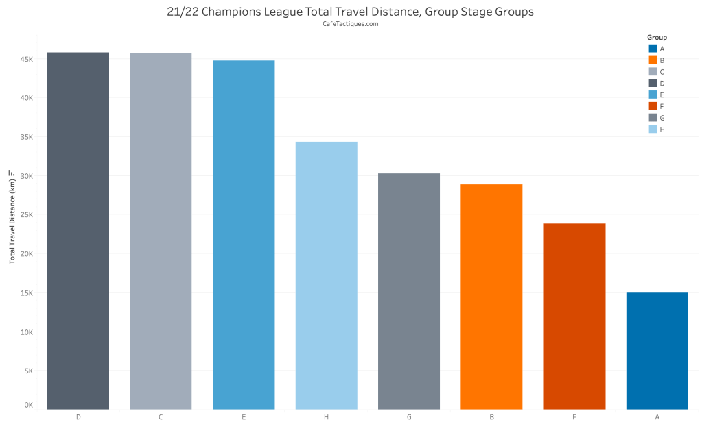 Now we could almost say we’re seeing a pattern—two pairs of clubs having similar travel as each other, but a large proportion more or less than the other pair. Even though this is the second-fewest total travel for an entire group, 3 teams—if not all 4—have a good chance at progressing. This is yet another group that should be fun to follow to see if travel distance and time has an impact on performances.