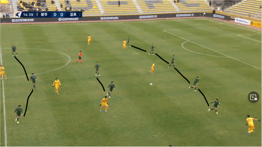 Gimpo’s center backs played a relatively deep line, not wanting to venture too high, which would have given Gwangju’s attackers too much space to exploit. Gimpo’s center backs were also slower than Gwangju’s players, so they needed to stay deeper for that reason as well.