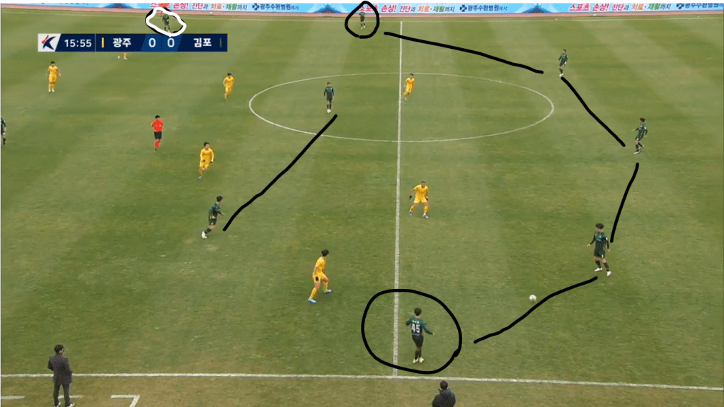 An interesting element of their attacking transition was that Gimpo didn’t seem to care if the ball went out off one of their own players for a Gwangju throw in. Of course, wasting time was one of their tactics, but Gimpo were okay with giving possession away but moving it 20+ meters from where the ball was previously—just like in rugby when a team purposefully kicks the ball out just to move it away from their half.