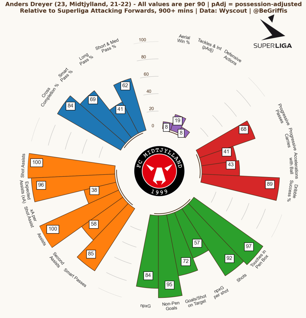 Striker/Right winger Anders Dreyer returned to the club in March, on loan from Rubin Kazan in Russia where he transferred to at the start of the season. He rejoined permanently at the start of the month which should be a big plus for the club. He was involved in 1.08 goals & assists per 90 minutes in his 16 total matches for Midtjylland this season, and his radar below shows his crazy production.