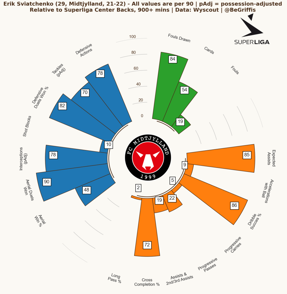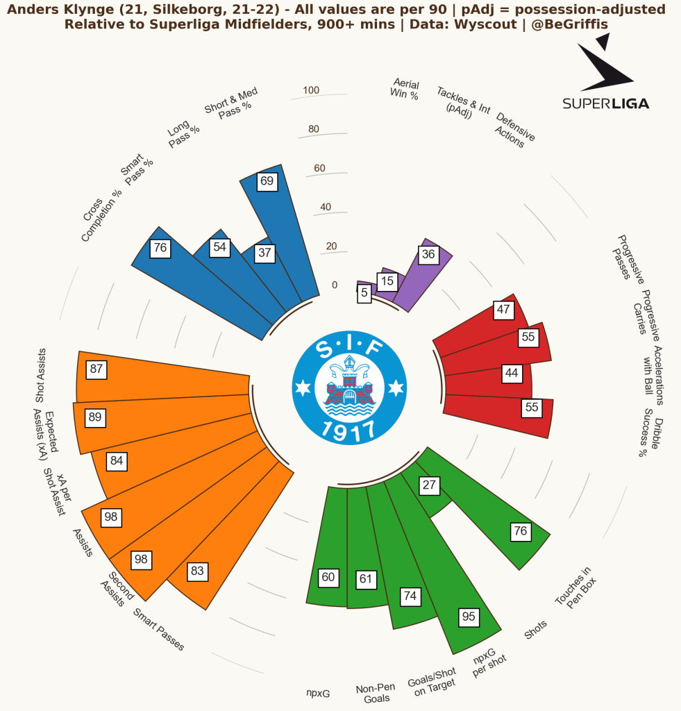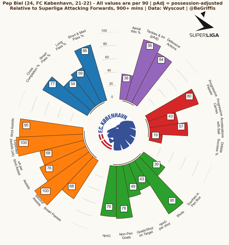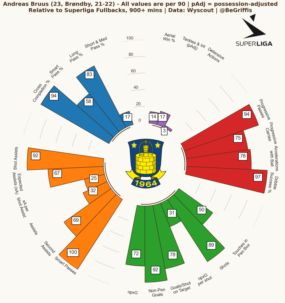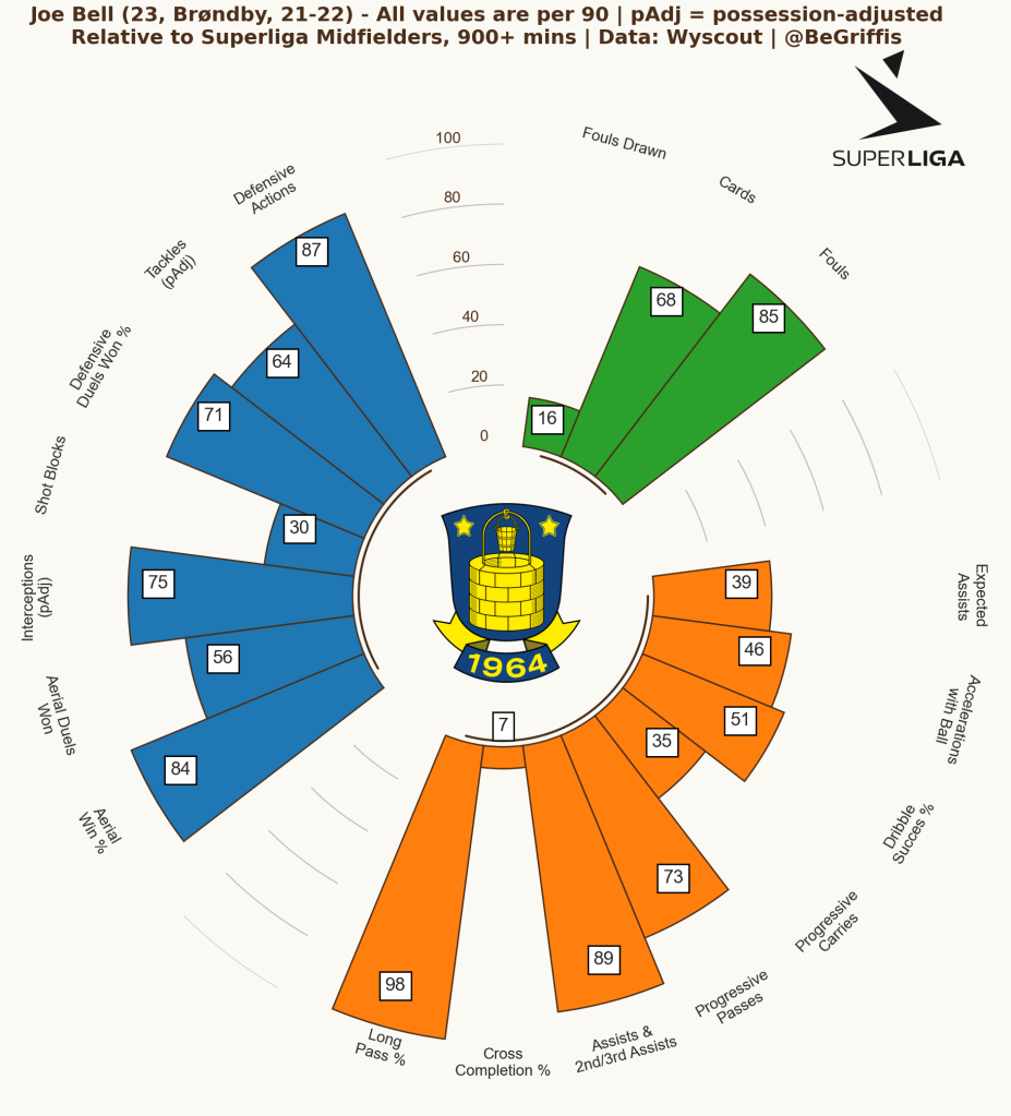 Joe Bell was very important as a defensive midfielder after moving from Viking in Norway to Brøndby in February. This radar below is more defense-focused, showing his strong ability sitting in front of the back line. Note that fouls and cards are a reverse axis, so being 85th percentile for fouls committed means he committed very few fouls per 90 minutes compared to other midfielders. He’s also a tidy passer with good vision, shown by being one of the best long passers from midfield and being heavily involved in goal scoring chains, at the 89th percentile for 2nd & 3rd assists per 90.