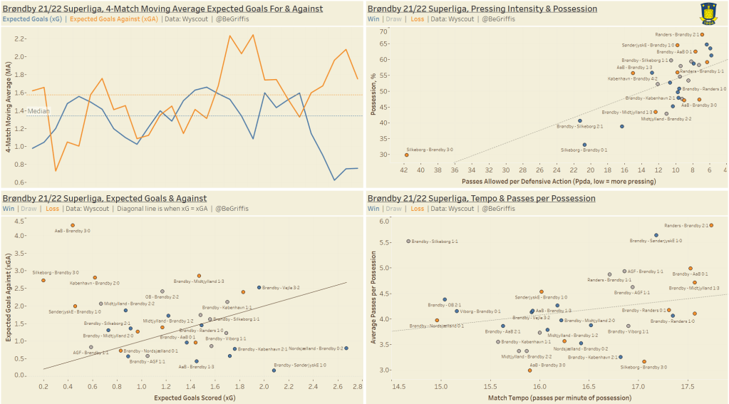 With that in mind, we can look at Brøndby’s xG & xGA per match chart in the bottom left. They were very good at turning negative xGD games into victories, winning 5 they were expected to lose. A 5-5-8 record in negative xGD matches is admirable, but what’s not admirable is the sheer number of games where their xGA was greater than their xG. That’s a key area for Niels Frederiksen to work on ahead of the new season. While they may have been good at winning those games, they would be better suited having fewer of them, of course (that’s not a novel analysis either!). They only lost 2 games they were expected to win, so an improved defense would be important going forward.