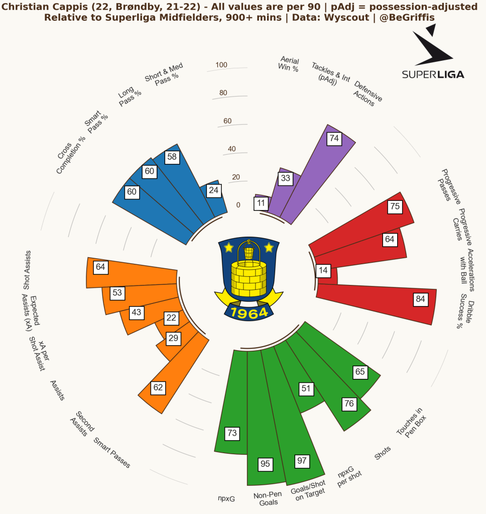 Cappis may not be the most reliable midfielder in defense (compared to all other midfielders with at least 900 minutes, his defensive duel win % is very average), but he is a decent goal threat coming out of the midfield, important to Brøndby’s ball progression up the pitch when he plays, and a relatively tidy passer with a little penchant for trying a few high-risk high-reward passes as well. Being just 22, if he can get some more consistent playing time next season he could continue to improve and possibly make a case for being a nailed-on starter with Joe Bell and Anis Ben Slimane. He played about 40% of the minutes he was available for in the Superliga last season.