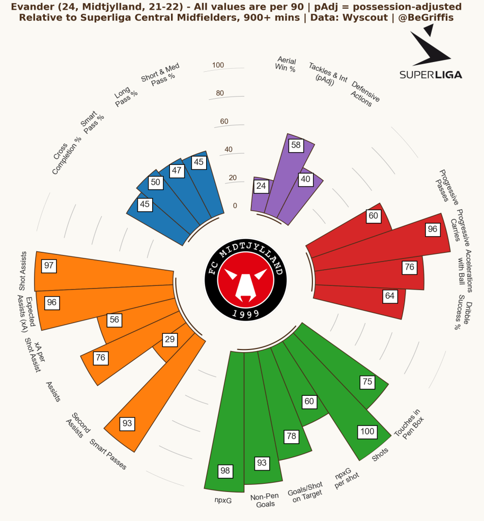 A third key player, this time in the midfield, is Evander. So much of Midtyjlland’s midfield creativity comes from him, recording some of the highest numbers in shot assists, smart passes (passes aimed at breaking down opponent lines), and expected assists (xA). He’s also got an eye for goal, being Midtjylland’s joint-top non-penalty scorer this season with 8.