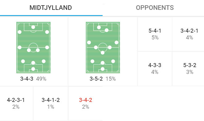 FC Midtjylland were very consistent in their formation last season. 3-4-3 almost half the time, with a 3-5-2 being their 2nd most-used formation at just 15% of the season. In the single pre-season match played so far they lined up in a 3-4-3, so expect to see Henriksen line up in a similar fashion this coming season.