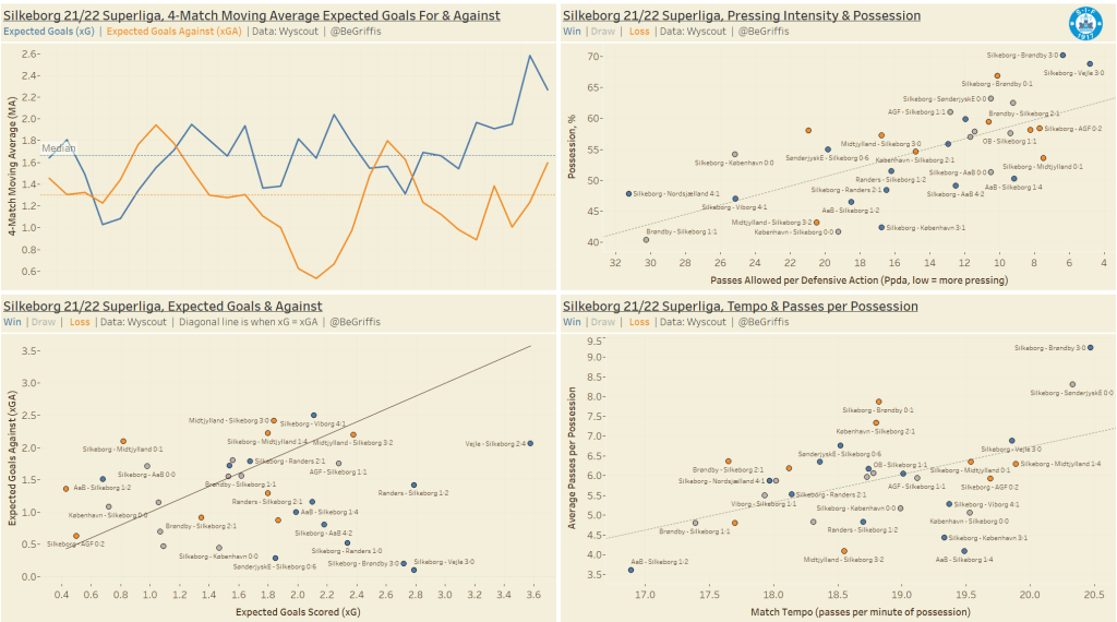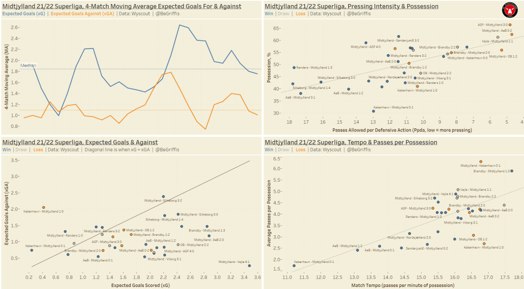 Looking at these selected data, two key areas for improvement this coming season for Midtjylland are being able to win games they’re expected to win, as well as to get better at winning games where they press intensely. Even marginal improvements there could have led to them lifting the title, as they finished just 3 points behind Copenhagen.
