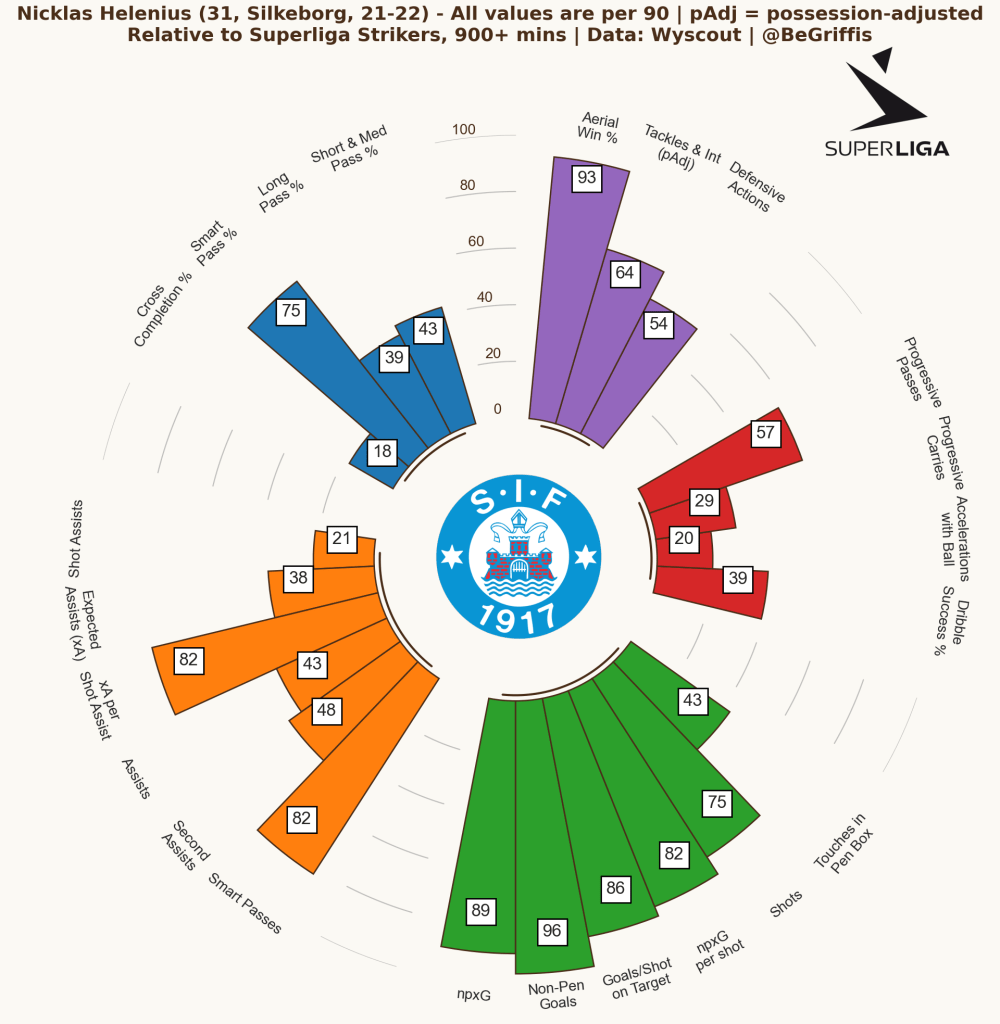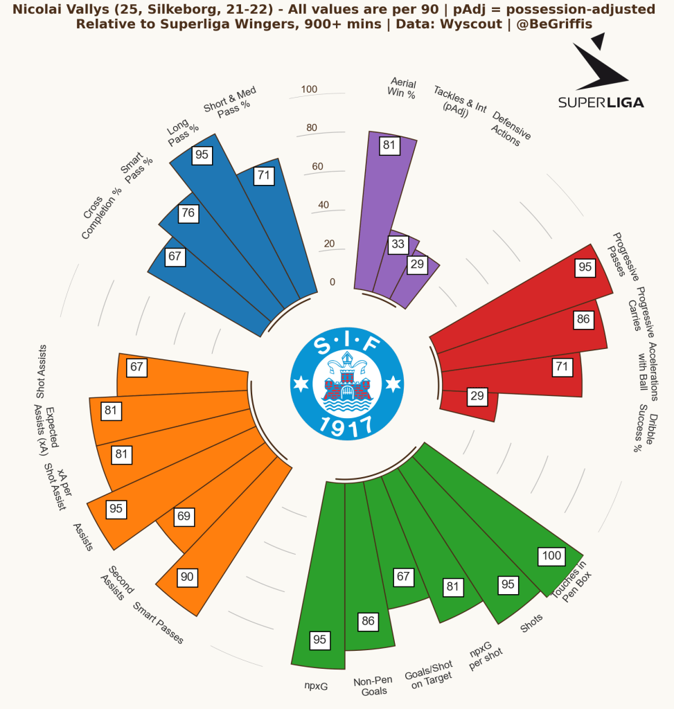 Another vital player to Silkeborg was left winger Nicolai Vallys. One of the top wingers in the league, he was very good at passing, creativity, goal scoring and shooting, and progression. He’s also not too bad at winning aerial duels. His contribution from the left flank was key for Silkeborg and being just 25, we should expect him to be at least as good next season as well.