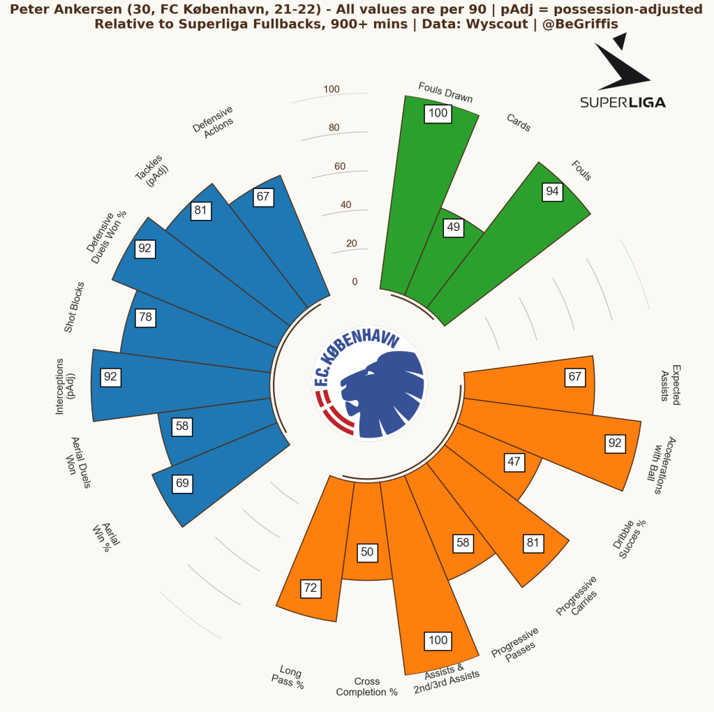A second player who was very important to Copenhagen was right back Peter Ankersen. Ankersen was not only very reliable in defense, but also key to facilitating Copenhagen’s many attacks down the right flank. In many of their matches, FC Copenhagen produced more xG from the right flank than from the left flank or center of the park. This is in no small part due to Ankersen. A key metric I want to call out for him is that he ranked #1 for all fullbacks with at least 900 minutes played in combined second & third assists. While his crossing might be perfectly average against other fullbacks, being able to be involved in Copenhagen’s attacks while still being one of the best fullbacks in the league for defensive metrics helped the entire team.