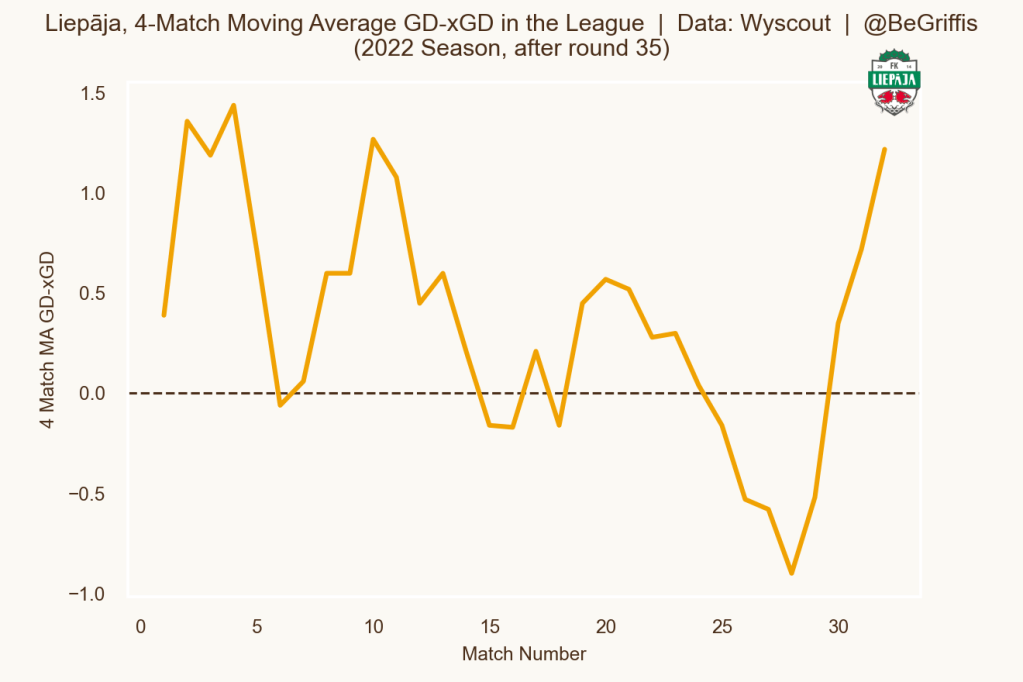 Now let’s look at the same info for Liepāja. Liepāja’s GD-xGD has seen a similar trend to Valmiera over recent matches. However, Liepāja’s over-performing form in this current stretch is longer. This sets us up for an interesting final match!
